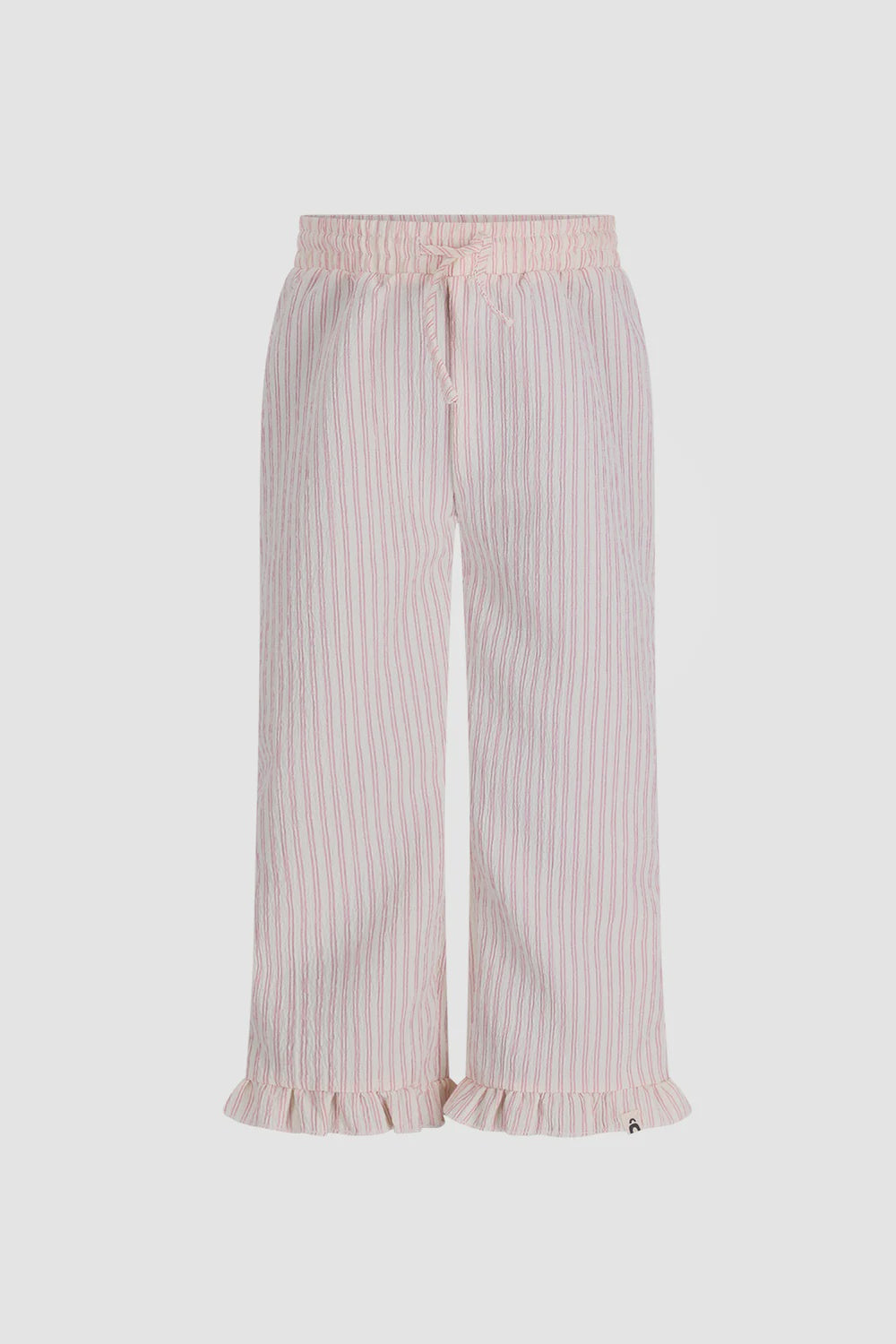 Broek Tate in wit met roze streepjes is een luchtige en comfortabele broek met een speelse uitstraling. De rechte pijpen en subtiele ruches aan de zoom geven de broek een zachte, girly touch, terwijl de elastische taille zorgt voor optimaal draagcomfort. Perfect voor zomerse dagen vol beweging.